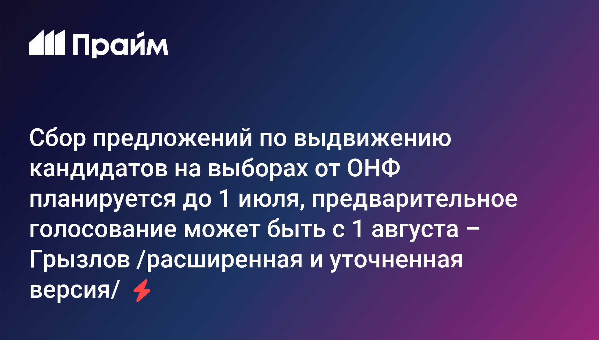 Сбор предложений по выдвижению кандидатов на выборах от ОНФ планируется до 1 июля, предварительное голосование может быть с 1 августа – Грызлов /расширенная и уточненная версия/