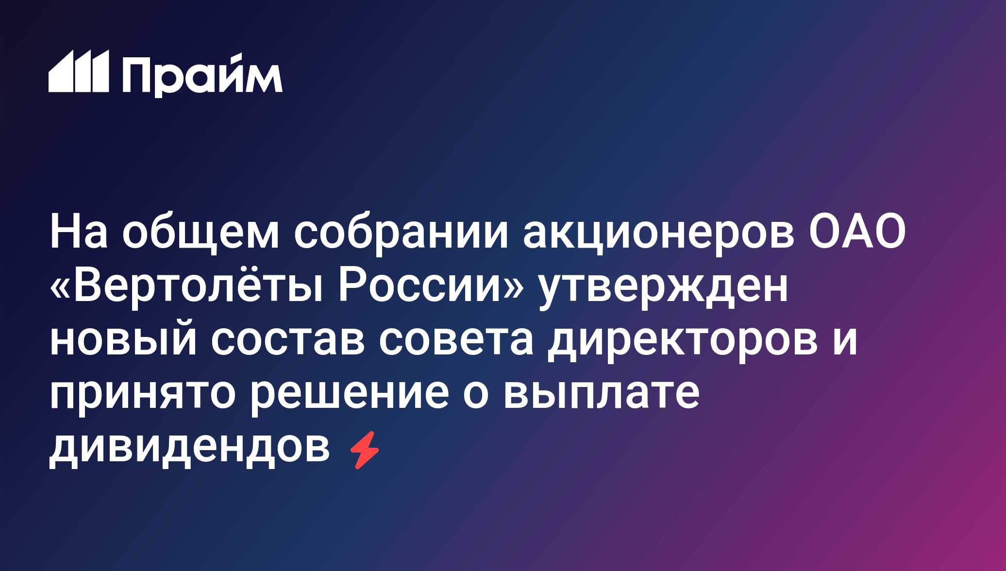 Акционеры ОАО «Вертолеты России» приняли решение о выплате дивидендов по обыкновенным акциям в размере 5,15 рублей на 1 акцию. Компания направит на выплату дивидендов 25 процентов от чистой прибыли ОАО «Вертолеты России» за 2011 год без учета прибыли, полученной в результате переоценки акций ОАО «Казанский вертолетный завод» и ОАО «Улан-Удэнский авиационный завод», находившихся в собственности ОАО «Вертолеты России» по состоянию на 31 декабря 2011 года.