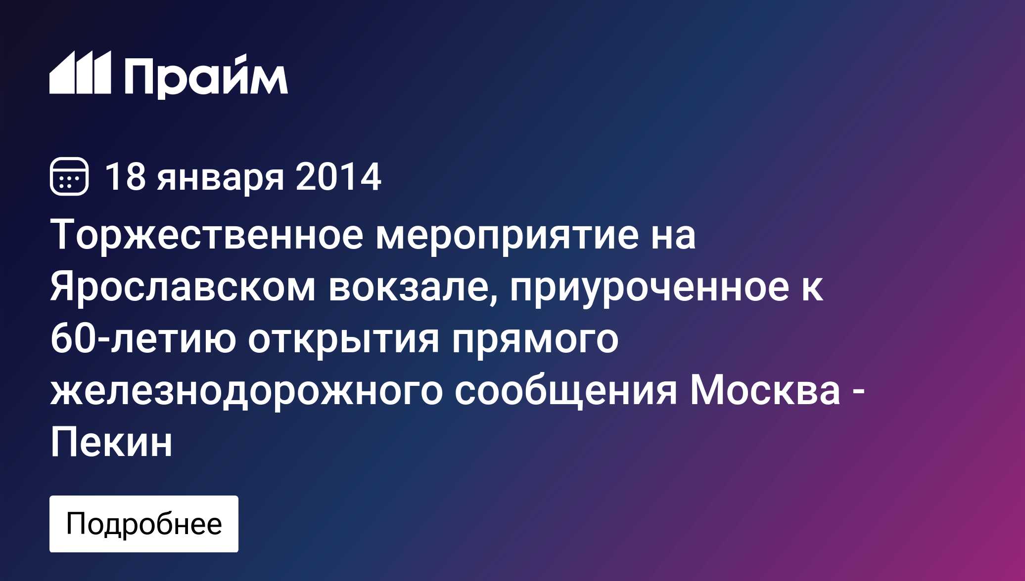 ОАО «Федеральная пассажирская компания» приглашает представителей СМИ принять участие в мероприятии, посвященном отправлению в юбилейный рейс международного фирменного поезда № 20/19 сообщением Москва - Пекин в связи с 60-летием с момента начала прямого железнодорожного сообщения между столицами России и Китайской Народной Республики.